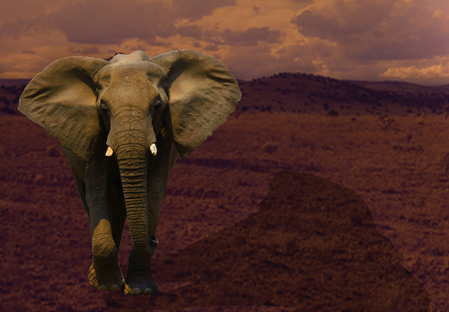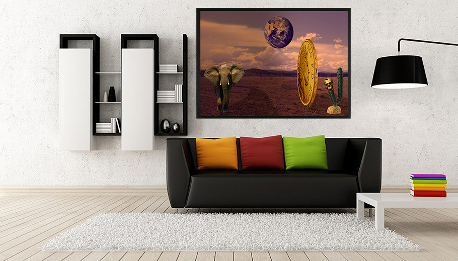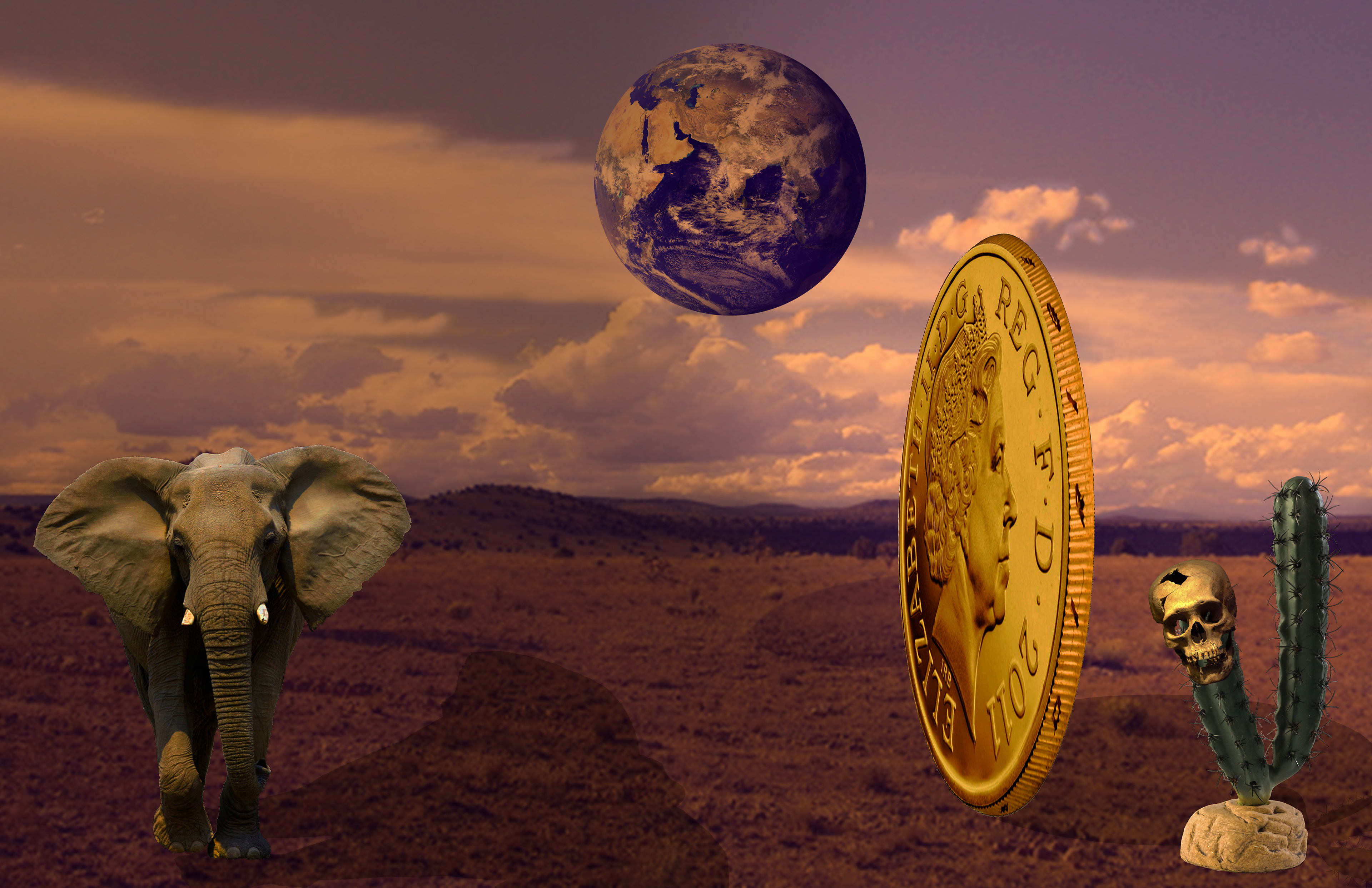A recreation of an imaginary desert world of an elephant, a giant coin, a skull, and a cactus. These were all composited together using Adobe Photoshop using selection tools, curves, masking, and brushes.